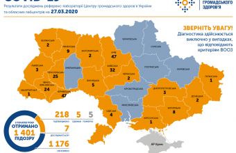 За результатами досліджень вірусологічної референс-лабораторії ЦГЗ України та обласних лабораторних центрів загалом підтверджено 218 випадків COVID-19.