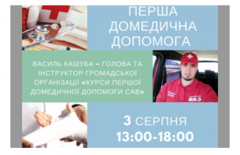 Про це повідомили сьогодні, 3 серпня, у Львівській облдержадміністрації, де також конкретизували: «Від 13:00 до 17:00 відбудеться практичне заняття «омедична підготовка» (Василь Кашуба, громадська організація «Курси першої домедичної допомоги «САВ»). Місце проведення – Львівський обласний молодіжний центр на вулиці Винниченка, 12)».