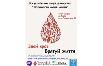 «Первинний осередок ВМГО (Всеукраїнської молодіжної громадської організації. – «ЩЛ») ФРІ ФРІ ПЛЮС «Фундація регіональних ініціатив» бере участь у Всеукраїнському проекті ВМГО ФРІ «Допомогти може кожен», який проходитиме впродовж двох днів. 10 та 11 грудня групи волонтерів відвідуватимуть Львівський обласний центр служби крові на вулиці Пекарська, 65, для добровільної здачі крові», – повідомили сьогодні, 2 грудня, «Щоденному Львову» в прес-службі міської ради, де також поінформували:
