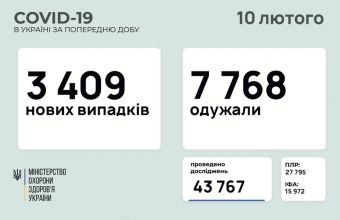 Міністерство охорони здоров'я сьогодні повідомило про 3409 нових випадків коронавірусної хвороби COVID-19 зафіксованих в Україні станом на 10 лютого 2021 року.