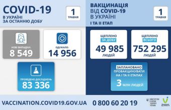 8 549 нових випадків коронавірусної хвороби COVID-19 зафіксовано в Україні станом на 1 травня 2021 року. Зокрема, захворіли 374 дитини та 145 медпрацівників.