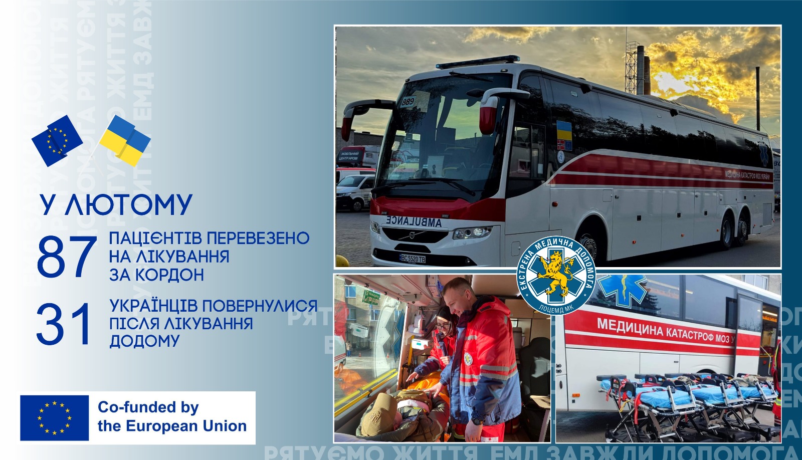 Про це повідомив Львівський обласний Центр ЕМД, пише DailyLviv.com. За лютий 2026 року Львівський обласний центр екстреної медичної допомоги та медицини катастроф здійснив перевезення 87 пацієнтів та 32 осіб супроводу на лікування за кордон.