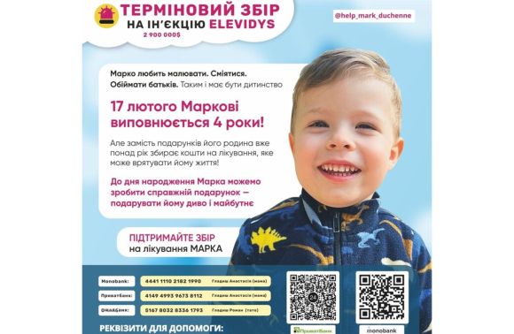 Нагадуємо, Марк Гладиш має діагноз м’язова дистрофія Дюшена — рідкісне генетичне захворювання, яке поступово призводить до втрати рухових функцій і здатності самостійно дихати. Єдиний шанс зупинити розвиток хвороби — спеціалізоване лікування вартістю 122 млн грн. Родина хлопчика збирає кошти вже понад рік і потребує підтримки всієї громади.