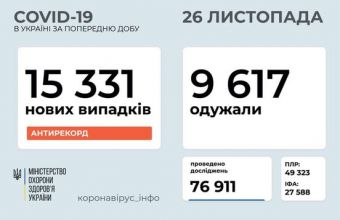 В Україні за добу зафіксували рекордний 15 331 новий випадок зараження коронавірусом, повідомив міністр охорони здоров'я Максим Степанов у четвер, 26 листопада, на своїй сторінці у Facebook, пише DailyLviv.