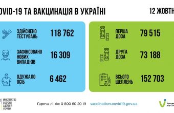 За добу 12 жовтня 2021 року в Україні зафіксовано 16309 нових підтверджених випадків коронавірусної хвороби COVID-19 (з них дітей – 1588, медпрацівників – 288).