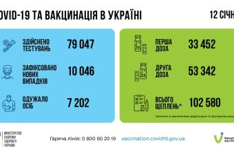 За добу 12 січня 2022 року в Україні зафіксовано 10 046 нових підтверджених випадків коронавірусної хвороби COVID-19 (з них дітей – 590, медпрацівників – 255).