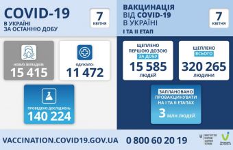 15 415 нових випадків коронавірусної хвороби COVID-19 зафіксовано в Україні станом на 07 квітня 2021 року. Зокрема, захворіли 636 дітей та 437 медпрацівників.