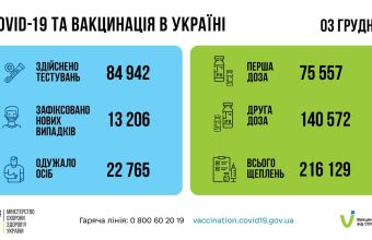За минулу добу в Україні проти COVID-19 було щеплено 216 129 осіб. Найбільшу кількість щеплень за 3 грудня було проведено у м. Києві – 24 362. На другому місці - Дніпропетровська область - 16733, на третьому - Львівська - 15785.