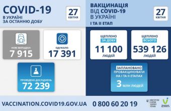 7 915 нових випадків коронавірусної хвороби COVID-19 зафіксовано в Україні станом на 27 квітня 2021 року. Зокрема, захворіли 336 дітей та 202 медпрацівники.