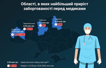 На початок досліджуваного періоду (10 березня) борг по зарплатах у медзакладах Львівської області становив 6,643 млн. Та під час карантину, за період з 10 березня по 18 травня, борг по зарплатах медперсоналу там виріс на 6,33 млн грн до 12,97 млн грн. Для порівняння за аналогічний період у Тернопільській приріст боргу склав 1,79 млн грн, у Сумській ‒ 0,39 млн грн та в Київській області ‒ 0,72 млн грн.