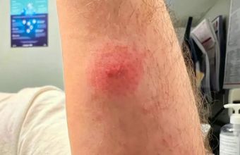 У 60-70% інфікованих людей на місці укусу кліща через деякий час (на 2-4-й день, іноді через 2 місяці, а найчастіше через 12-14 днів) виникає червона пляма, яка з часом зростає в розмірах і може сягати в діаметрі до20-30 см і більше. Поява червоної плями після присмоктування кліща є прямим показом для звернення до лікаря і лікування хвороби Лайма.
