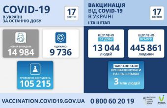 14 984 нових випадки коронавірусної хвороби COVID-19 зафіксовано в Україні станом на 17 квітня 2021 року. Зокрема, захворіли 606 дітей та 276 медпрацівників.