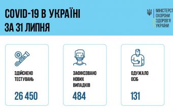 За добу 31 липня 2021 року в Україні зафіксовано 484 нові підтверджені випадки коронавірусної хвороби COVID-19 (з них дітей – 16, медпрацівників – 7).