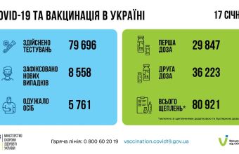 За добу 17 січня в Україні зафіксовано 8 558 нових підтверджених випадків коронавірусної хвороби COVID-19 (з них дітей – 811, медпрацівників – 304).