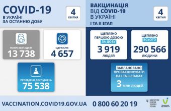 13 738 нових випадків коронавірусної хвороби COVID-19 зафіксовано в Україні станом на 04 квітня 2021 року. Зокрема, захворіли 504 дитини та 216 медпрацівників.