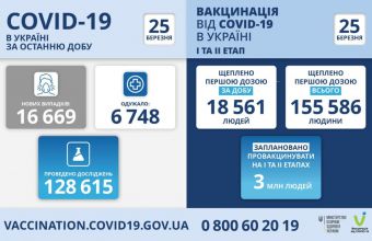 16 669 нових випадків коронавірусної хвороби COVID-19 зафіксовано в Україні станом на 25 березня 2021 року. Зокрема, захворіли 786 дітей та 446 медпрацівників.