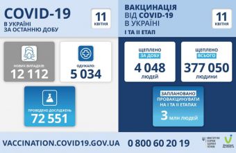 12 112 нових випадків коронавірусної хвороби COVID-19 зафіксовано в Україні станом на 11 квітня 2021 року. Зокрема, захворіли 524 дитини та 181 медпрацівник.