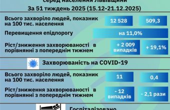 На Львівщині з 15 по 21 грудня зареєстровано 12 528 випадків гострих респіраторних вірусних інфекцій. На 2 тисячі більше хворих, ніж за попередній тиждень.