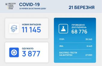 11 145 нових випадків коронавірусної хвороби COVID-19 зафіксовано в Україні станом на 21 березня 2021 року. Зокрема, захворіли 585 дітей та 199 медпрацівників.