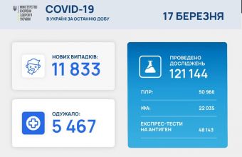 11 833 нових випадки коронавірусної хвороби COVID-19 зафіксовано в Україні станом на 17 березня 2021 року. Зокрема, захворіли 609 дітей та 388 медпрацівників.