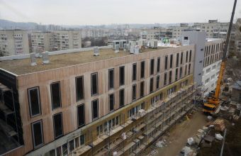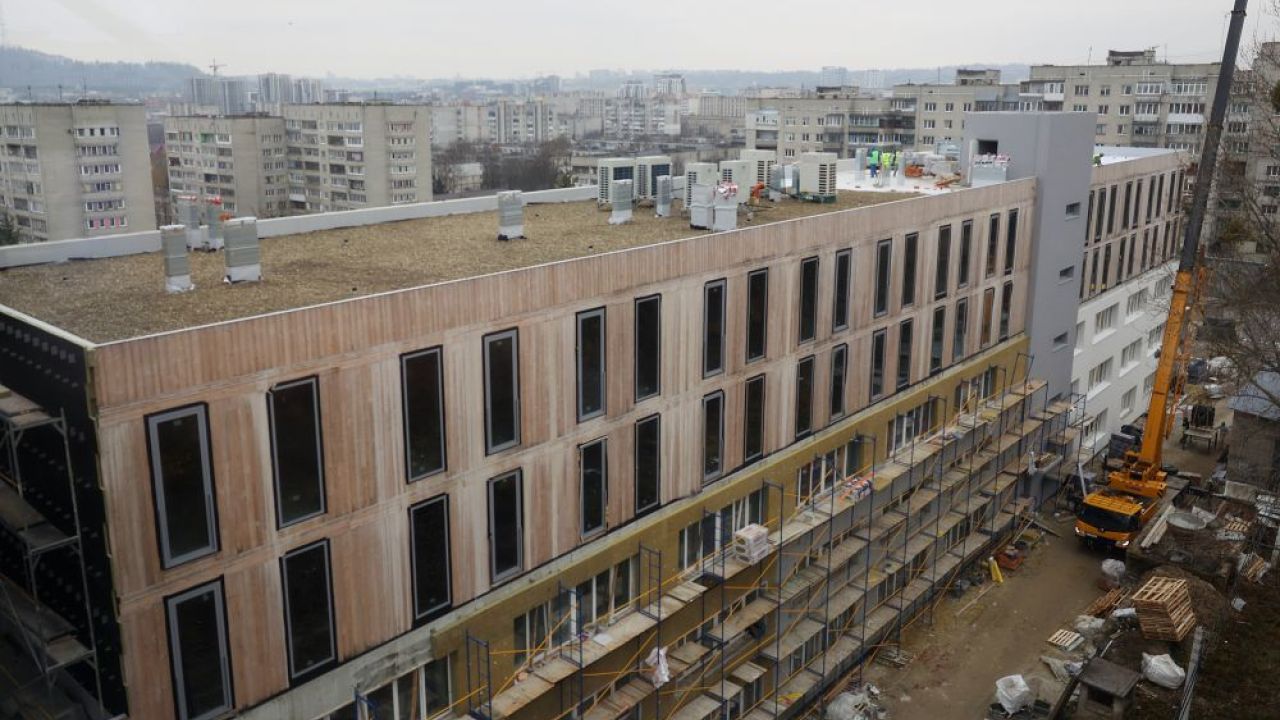 «Так, як будівля поліклініки стара і не було можливості фактично надбудувати повноцінні два поверхи, прийшли рішення зробити їх з надлегких якісних конструкцій – дерева. Це CLТ панелі, які дуже швидко монтуються. Є три поверхи існуючої будівлі, яка була реконструйована. Два поверхи з них – 2 і 3, захищені сонцезахисними панелями, які дозволяють зберегти електроенергію та протидіяти перегріванню приміщень. А два верхні поверхи, які надбудовані з дерева, спеціально виділені окремо – щоб показати, що це різний контекст і різний матеріал», - розповів Андрій Сікачовський, співвласник компанії «абмк».
