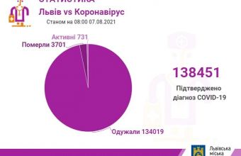 За даними ДУ «Львівський обласний лабораторний центр МОЗ України», станом на 07 серпня у Львівській області зареєстровано 138451 підтверджений випадок захворювання на COVID-19, з них у Львові - 67462; за останню добу - 62 випадки, з них у Львові - 24.
