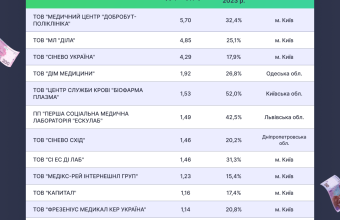 6-та позиція – лабораторія “Ескулаб” (1,49 млрд грн), 7-ма – “Сінево Схід” (1,46 млрд грн) та 8-ма – CSD Lab (1,46 млрд грн)