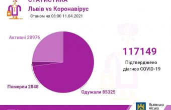 За оперативними даними, станом на 11 квітня у Львівській області зареєстровано 117149 підтверджених випадків захворювання на COVID-19, з них у Львові – 57727, за останню добу - 720 випадків, з них у Львові - 383.