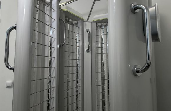 Перед кожною процедурою апарат проходить тестування. Пацієнт заходить у спеціальну кабіну в захисних окулярах. Кабіна складається з п’яти секцій, має захисні решітки та унеможливлює контакт із лампами.