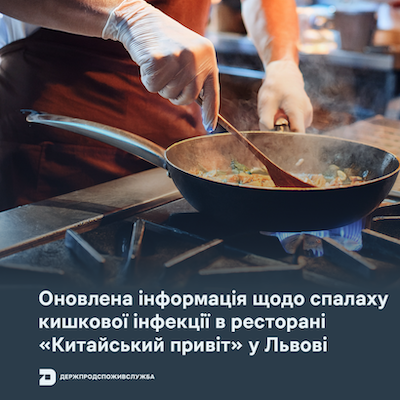 Про це повідомила Держпродспоживслужба пише DailyLviv.com. Станом на сьогоднішній ранок до лікарні госпіталізовано 76 людей, серед яких 10 дітей та 2 вагітних. Усі вони відвідували ресторан «Китайський привіт» у м. Львів. За результатами аналізів у 25 пацієнтів та 1 працівника ресторану виявили бактерію Salmonella enteriditis, яка викликає кишкові інфекції. Щодо 4 інших працівників наразі триває лабораторне дослідження.
