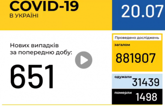 20 липня в Україні - 59 493 лабораторно підтверджені випадки COVID-19, з них 1498 летальних, 31 439 пацієнтів одужало. За добу зафіксовано 651 новий випадок.