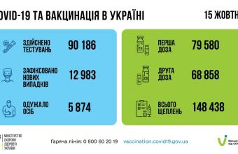 Найбільшу кількість щеплень за 15 жовтня 2021 року було проведено у Дніпропетровській області – 14 923 щеплення, а за ввесь період вакцинальної кампанії – у м. Києві – 1 930 977 щеплень.