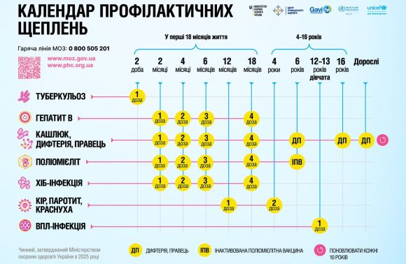 "Оновлений Календар профілактичних щеплень з 1 січня 2026 року охоплюватиме обов'язкову вакцинацію проти 11 інфекційних захворювань: туберкульоз, гепатит В, кір, паротит, краснуха, поліомієліт, дифтерія, правець, кашлюк, ХІБ-інфекція та вірус папіломи людини (ВПЛ)", – зазначають у відомстві.