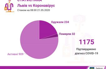 Станом на 08.00 год у Львові та на Львівщині підтверджено 1175 випадків інфікування коронавірусом, з них 32 — летальні.