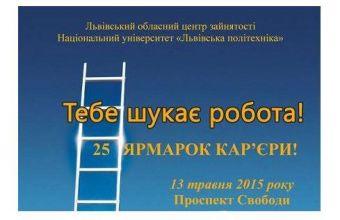 «Львівський обласний центр зайнятості та Національний університет «Львівська політехніка» запрошують студентів і випускників вищих навчальних закладів на ХХV «Ярмарок кар’єри». Захід відбудеться 13 травня 2015 року на проспекті Свободи у Львові. Початок – о 10- й годині.