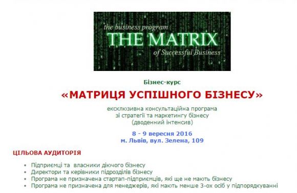 «Навчання організовують експерти «Громадської Школи Бізнесу» з метою допомогти малим підприємцям уникати поширених помилок і навчитися працювати ефективніше. Директор «Громадської Школи Бізнесу» Руслан Бельтюков зазначив: «Малий бізнес в Україні розвивається дуже повільно, що, відповідно, значно відтерміновує розвиток всієї економіки країни. Найвагоміша причина цього – неграмотність підприємців, які не розуміють структури бізнесу, не знають власних стратегічних цілей, не вміють аналізувати ринок тощо. «Матриця успішного бізнесу» – бізнес-інтенсив, який допоможе за короткий проміжок часу зрозуміти модель розвитку бізнесу на всіх його етапах».