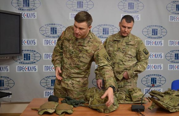 Демонструвати бронежилет десантника допомагає сержант Тарас Вінтоняк, який у шкільному віці переїхав з України в США і тепер проходить там військову службу.