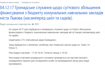 Про це повідомили в прес-службі Львівської міськради, де також розповіли: «Ініціатором є ГО «Батьківська рада Львівщини». Реєстрація учасників – з 17.30 до 18.00. Реєстрація учасників громадського слухання проводиться на підставі паспорту громадянина України (для посвідчення особи та підтвердження місця реєстрації проживання)».