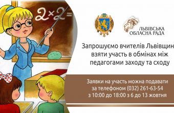 У прес-службі Львівської обласної ради повідомили сьогодні, 6 жовтня: «Львівська обласна рада разом з департаментом освіти та науки ЛОДА запрошує вчителів Львівщини взяти участь в обміні між педагогами заходу та сходу. Заявки на участь можна подавати за телефоном (код 032) 261-63-54 щобудня з 10:00 до 18:00 до 13 жовтня».