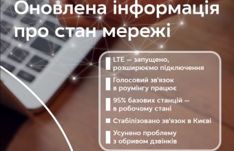 За минулу добу фахівці відновили послугу міжнародного голосового роумінгу; усунули проблему з обривами дзвінків; також відновили майже на 100% послугу «Домашнього Інтернету»; стабілізували зв'язок в Києві.
