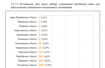 «Звіт, опублікований на офіційному сайті Українського центру оцінювання якості освіти, показує, що на ЗНО з російської мови у 2017 році зареєструвалися лише 3381 осіб (1,4% від загальної кількості учасників ЗНО). Найпопулярнішою російська мова була у Донецькій області. Втім, усе ж це невеликий відсоток: 6,63% людей захотіли скласти тестування з цієї дисципліни. Найменше охочих скласти російську мову було у Івано-Франківській області – 0,12 %», – поінформували також в інтернет-виданні «Українська правда. Життя».