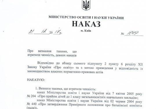 Згідно із підписаним міністром наказом, розпорядження від 2 червня 2004 року №440 «Про затвердження примірного положення про батьківські комітети (ради)» втрачає свою чинність. Скасування діяльності батьківського комітету, а також зміни до порядку прийому дітей у 1 класи загальноосвітніх навчальних закладів ухвалені відповідно до нового закону « Про освіту».