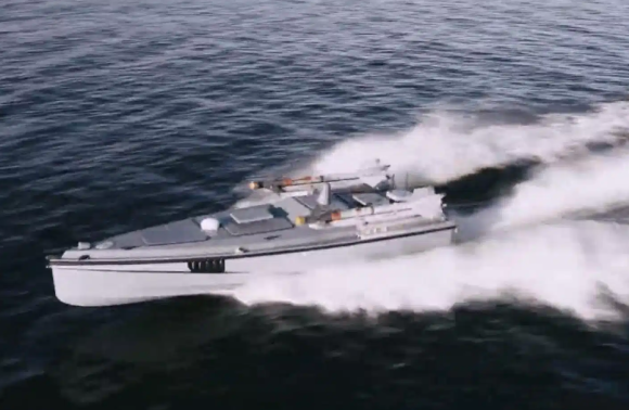 Надводний безпілотник Magura V7, озброєний двома ракетами Sidewinder. Ракети мають жовті захисні кришки над головками самонаведення, що свідчить про проведення випробувань.