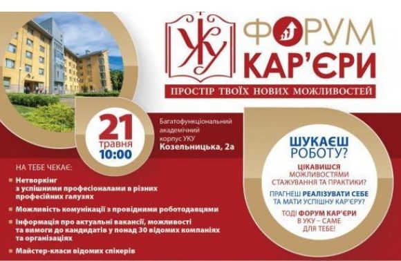«21 травня о 10:00 в Українському католицькому університеті (УКУ) на вулиці Козельницькій, 2 а відбудеться «Форум кар’єри», під час якого активні студенти, випускники та молоді спеціалісти, зацікавлені у працевлаштування та успішному професійному зростанні, зможуть зустрітися з провідними роботодавцями», – повідомили «Щоденному Львову» в прес-службі міськради, де також розповіли подробиці: