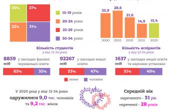 Майже дві третини молоді – міські жителі. На кожну тисячу жінок у віці 15–34 роки припало 1037 чоловіків. Найчисельнішою є група у віці 30–34 роки – 31,4% (199,0 тис. осіб).