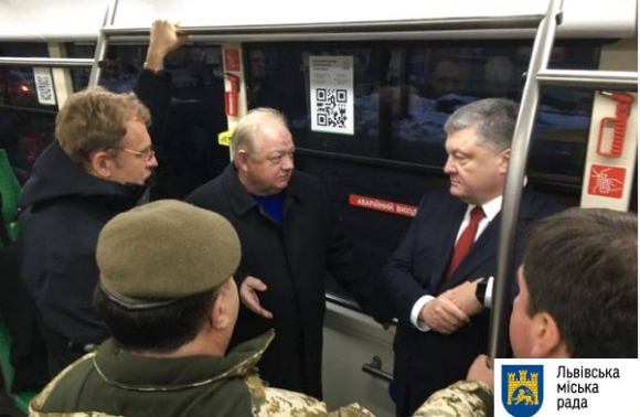У прес-службі Львівської міськради повідомили сьогодні, 6 грудня, що Президент України Петро Порошенко, голова Львівської облдержадміністрації Олег Синютка, голова Львівської обласної ради Олександр Ганущин і міський голова Львова Андрій Садовий проїхалися після зустрічі з громадою й журналістами в Медичному університеті в напрямку центру Львова в електробусі, в якому розповідав про його переваги перед іншими видами громадського транспорту голова правління ПАТ «Концерн-Електрон» Юрій Бубес.