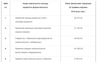 «6 квітня 2017 року, на пленарному засіданні Львівської міської ради затвердили Програму надання фінансової підтримки дошкільним та загальноосвітнім навчальним закладам мЛьвова приватної форми власності. Розмір фінансової підтримки для навчального закладу залежить від кількості учнів-вихованців, які у ньому навчаються», – поінформували також у прес-службі Львівської міськради та опублікували «Перелік навчальних закладів м. Львова приватної форми власності, яким надається фінансова підтримка за рахунок коштів міського бюджету Львова, та суми фінансової підтримки за травень-серпень 2018 року»