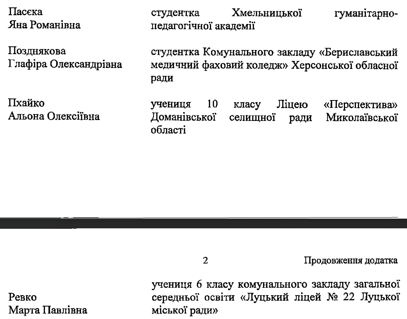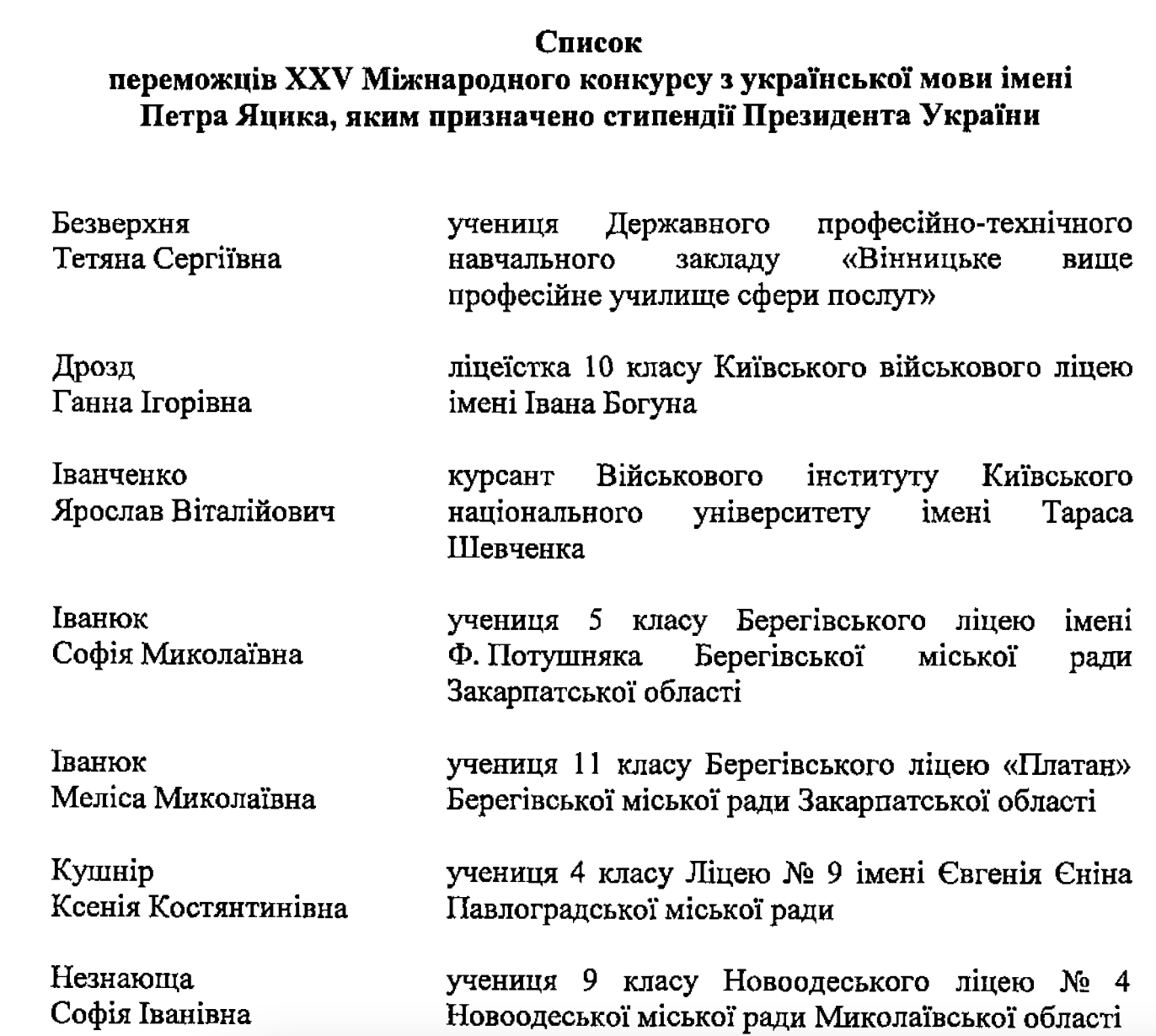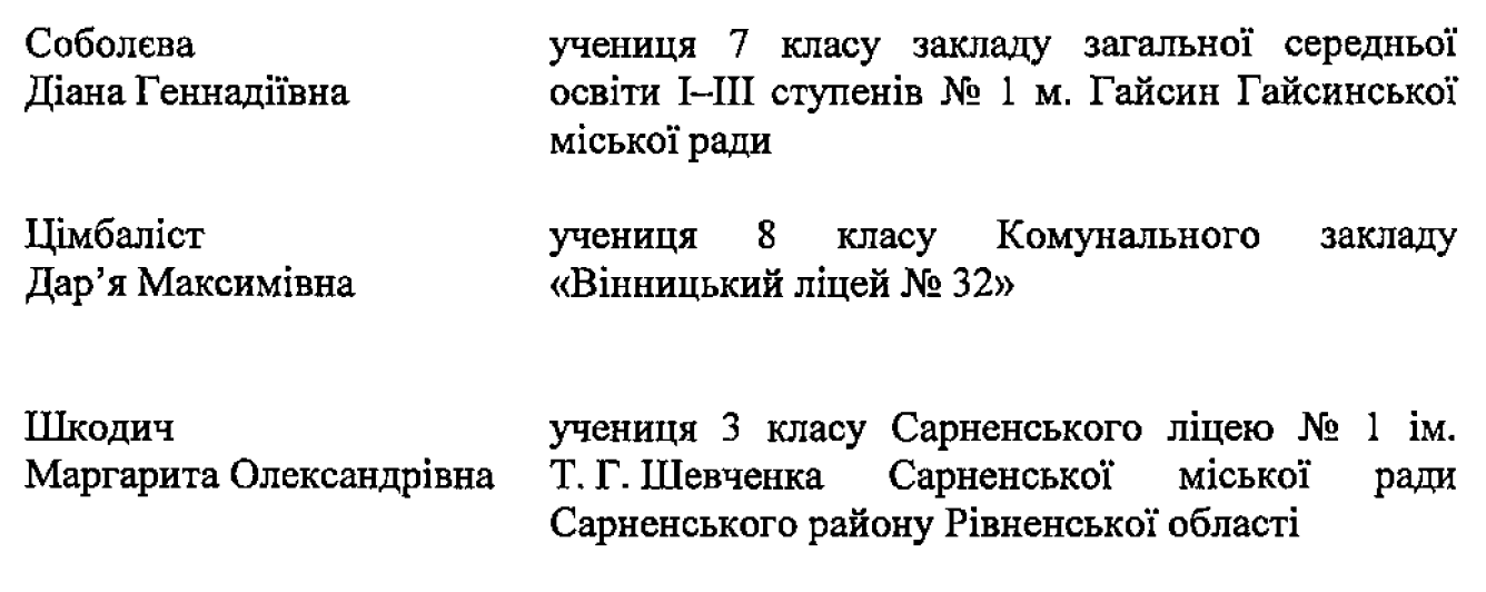 Серед стипендіатів Президента – учні закладів загальної середньої та професійної (професійно-технічної) освіти, студенти та курсанти закладів вищої освіти. Загалом – 14 осіб.