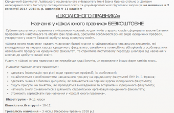 «Навчання триватиме упродовж трьох місяців, з березня до травня 2018 року. Заняття відбуватимуться щосуботи (три уроки по 45 хвилин) на юридичному факультеті Львівського національного університету імені Івана Франка. Навчання у «Школі юного правника» – безкоштовне. Організатори– Львівський національний університет імені Івана Франка, Інститут післядипломної освіти та доуніверситетської підготовки, Центр неперервної освіти. Детальнішу інформацію можна отримати за адресою: Львів, вулиця Січових Стрільців, 16, кім.103 (Центр неперервної освіти), або за телефонами (032) 239-44-89, 067-70-599-62, e-mail: cno-ipodp@ukr.net», – повідомили в прес-службі Львівської міськради облдержадміністрації.