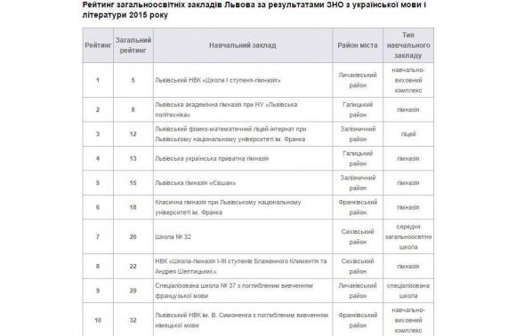Рейтинг загальноосвітніх навчальних закладів складено на основі загального рейтингу шкіл України за результатами ЗНО з української мови і літератури, що отримали випускники навчальних закладів у 2015 році. До рейтингу включено 109 львівських навчальних закладів, серед яких шість – ліцеї, 10 – гімназії, 14 – спеціалізовані школи, 69 загальноосвітні школи тощо.